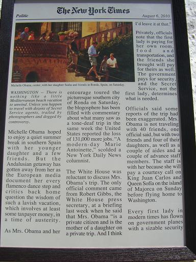 | Quelque chose vient de tomber... Ibiza bien sagement posée, temps était donné de découvrir les quelques charmes locaux, ceux-là mêmes qui avaient dû mener Michelle Obama à précéder de peu notre passage. De fait, la trace de ce passage était affichée avec fierté, voile pudique étant toutefois jeté sur la capacité bien décevante de la maison blanche à bénéficier d'un pifomètre de date de visite favorable. Sans rancune. Tout comme Michelle donc, nos pas nous avaient menés jusqu'au pont reliant les deux moitiés de la vieille ville, d'où le panorama confirmait bien qu'il fallait être un assaillant bien motivé pour décider de prendre d'assaut une telle cité, bien que quelques aménagemements aient pu être réalisés depuis pour faciliter l'exercice. |