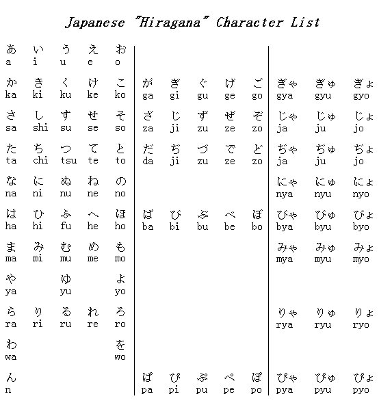 Fondamentalement, l'hiragana est le "vrai" alphabet japonais, ou tout du moins le plus courament utilisé. A la différence du français, vous remarquerez que chaque signe correspond à une véritable syllabe, ce qui a pour effet bénéfique de simplifier la construction d'une phrase et de limiter les fautes (moins de signes à placer = moins d'édifices branlants, c'est implacable). Reste qu'en contrepartie les signes se révèlent donc forcémment un peu plus nombreux :