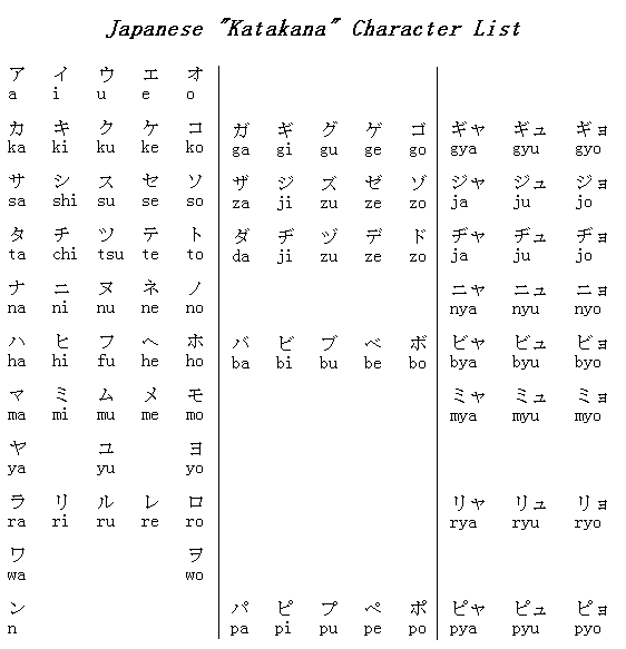 Second alphabet de la langue japonaise, il est intéressant de savoir que les "sonorités" qu'il définit sont les mêmes que celles issues de l'alphabet hiragana. Dans les faits, cet alphabet sert principalement à transcrire les mots étrangers (ce qui renforcera se présence sur les devantures de magasins et autres publicités utilisant des néologismes) :