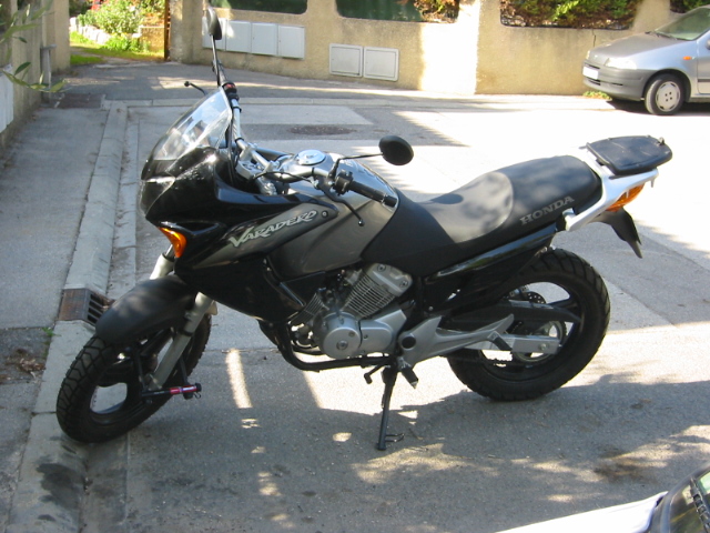 Juillet 2003 : ayant finalement fait le deuil de ma yamaha 125tdr (disparue 2 mois plus tôt dans des conditions plus que mystérieuses) je me décide à partir a la recherche d’une nouvelle 125 : convaincu à la base de me réengager auprès de monsieur yamaha, je rentre toutefois chez monsieur honda (il était sur le chemin) dans l’espoir d’avoir un petit aperçu de cette fameuse varadero que je croise de plus en plus souvent en ville : après une petite discussion avec le vendeur, me voilà devant la « bête », avec autorisation officielle de l’essayer pendant 1h (impossible de négocier la journée…). Premier constat : « c’est gros », bien plus gros que ce dont je me rappelais en tout cas et je me mets de suite a penser qu’avec elle, le bon vieux temps du slalom citadin est révolu. Deuxième constat (et plutôt logique après le premier), « c’est lourd !! » et effectivement , une fois dessus on a plus l’impression (désagréable pour moi) d’être aux commandes d’une vraie grosse 600 que d’une modeste 125 citadine .Tant pis me dis-je, de toutes façons je suis juste la pour me faire une idée ca n’engage à rien : d’un coup de clé je débloque donc le guidon et me traîne pitoyablement (c’est VRAIMENT lourd !) jusqu'à la sortie de l’atelier. Là, libération, je peux enfin mettre le contact et entendre un beau bruit feutré (vive le 4temps !) qui n’a plus rien a voir avec le petit coté pétrolette boostée de ma tdr : pas de toute, la varadero est vraiment une moto qui valorise son conducteur. Plutôt fier, je passe donc la première,désireux de me rendre compte par moi même de ses qualités routières, et je commence a avancer...