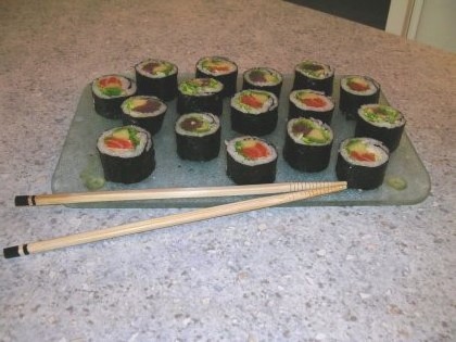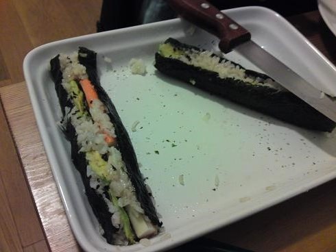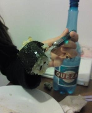 Oui. Peut être relire la recette : "étalez l'algue sur le plan de travail. Egouttez le riz, vinaigrez-le et nappez-le sur l'algue. Rajoutez le surimi et l'avocat coupé en lamelles. Finalisez en insérant quelques graines de Sésame et roulez". C'est pourtant pas compliqué. Ca avait l'air si simple de réussir la chose. C'était évident que j'allais obtenir ceci : ![]() Mais non, évidemment, et même en faisant bien attention, en la jouant plus millimétré qu'un épilateur, moi, j'ai eu ça : ![]() Un